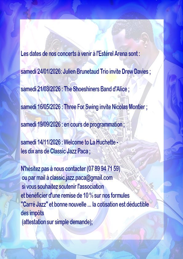 Classic Jazz Paca - association qui fêtera ses dix ans cette année a le plaisir de vous annoncer les dates retenues pour 2026